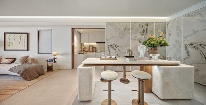 高颗粒度细节:样板间在收纳体系打造上别出心裁,规划了玄关柜、主卧衣帽间、一体化餐厅酒柜等,深入考量人性化需求,对收纳空间进行合理分区,提升了使用便捷性。